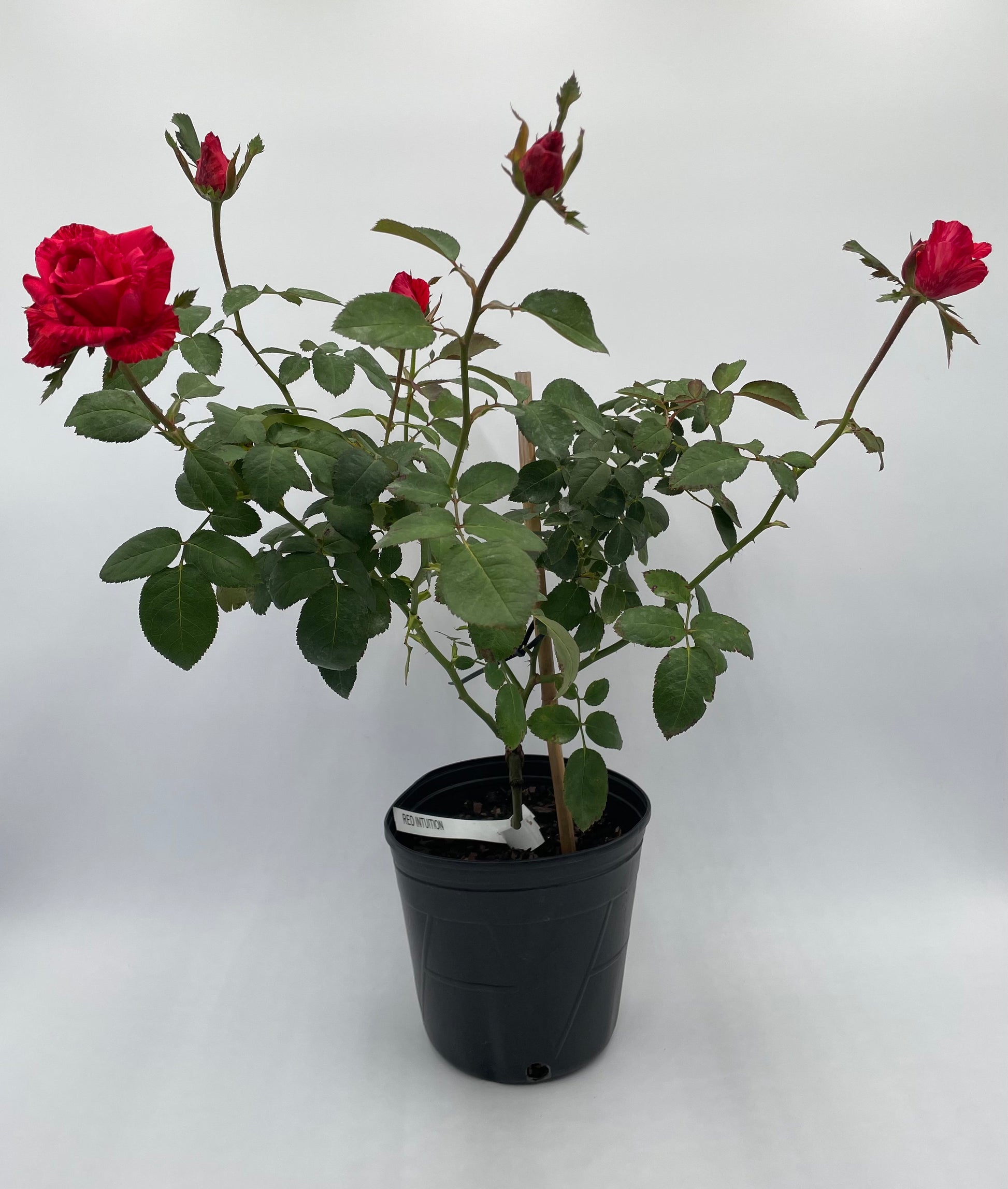 Red Intuition roses provide a classic, graceful look for any garden. This hybrid tea rose variety features bright red blooms with red on red stripes. Its tall buds and strong stems make it the perfect statement flower for your outdoor decor.